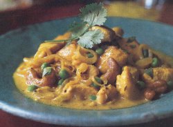 Heat 4 tbs oil in a large frying pan over a medium heat. Add garlic and onions and stir-fry until onions begin to brown at edges. Add the ginger, green chili, fresh cilantro and 3 tbs water. Cover, lower heat, and simmer 3 minutes.